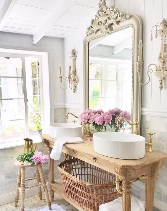 Aunque te parezca extraño los baños provenzales se visten con antigüedades y piezas vintage. ¿Antiguedades en el baño? Pues sí, puede ser una cómoda o consola antigua convertida en mueble de baño, un espejo, un lámpara, una cesta, un grifo recuperado, etc…