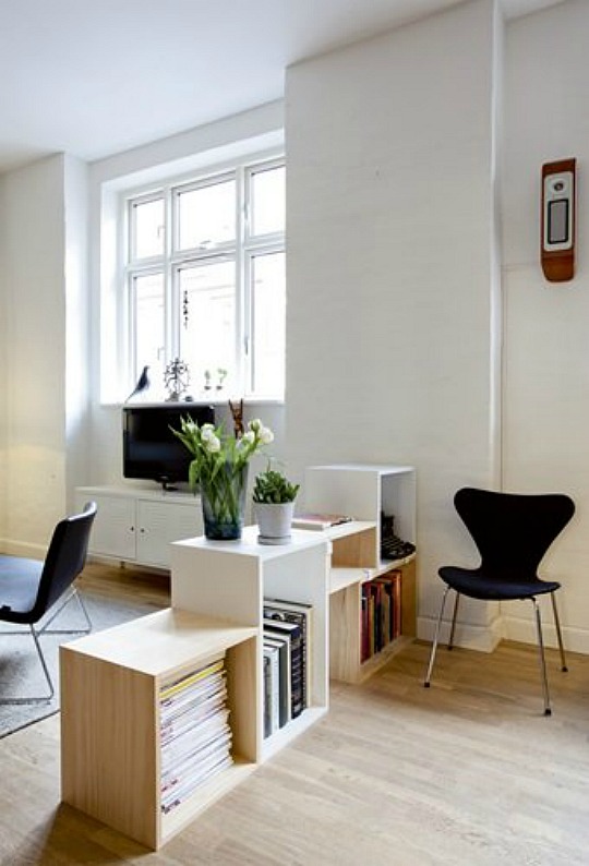 3- Estantería, también formada por cajas de varios tamaños y acabado madera natural que destaca sobre la pared oscura: bobedre.dk