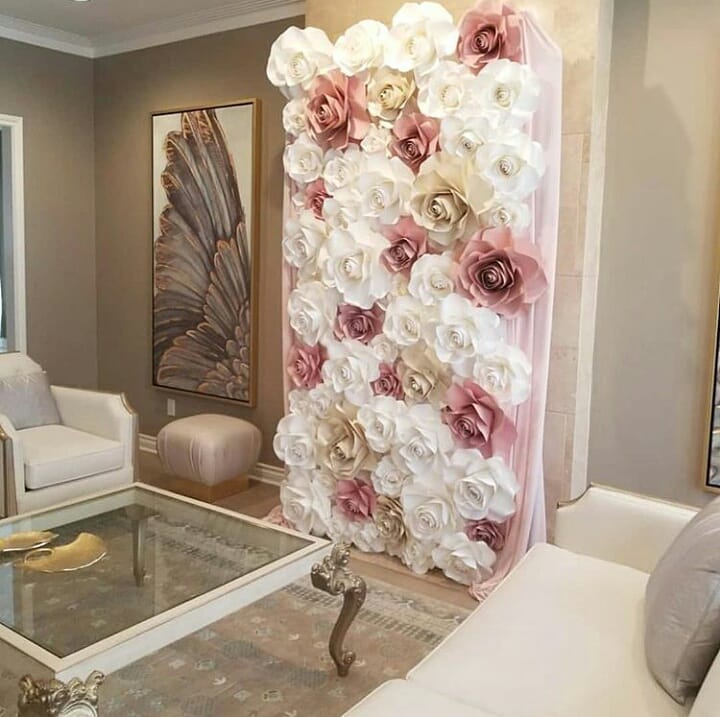 Otra ventaja es la total personalización en cuanto a colores y diseños. Te aconsejamos que realices unos primeros modelos de prueba. Comprueba cómo quedan en la estancia antes de comprar el resto de material, pues aunque es muy barato, vas a necesitar muchas cartulinas si quieres un gran panel floral.