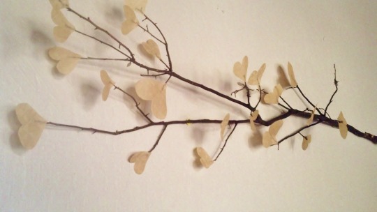 1- Corazones de papel colgados con hilo de una ramita, también se han añadido al conjunto unos adorables pajaritos: thehousethatlarsbuilt.com