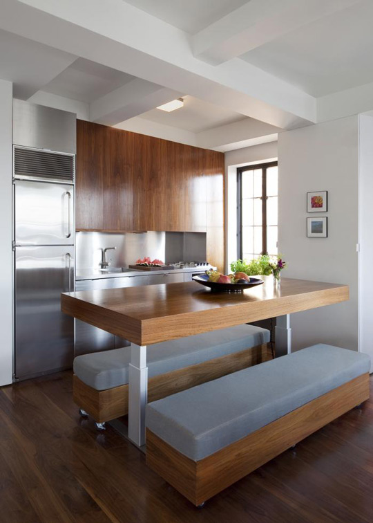 La mesa de la cocina regulable a tres alturas, se puede usar como isla, mesa de comedor o mesa de trabajo. Otra cosa que nos encanta de este rincón es que los asientos son dos bancos que ruedas que se pueden trasladar a otros lugares de la vivienda o aparcar justo debajo de la mesa para liberar espacio de paso.