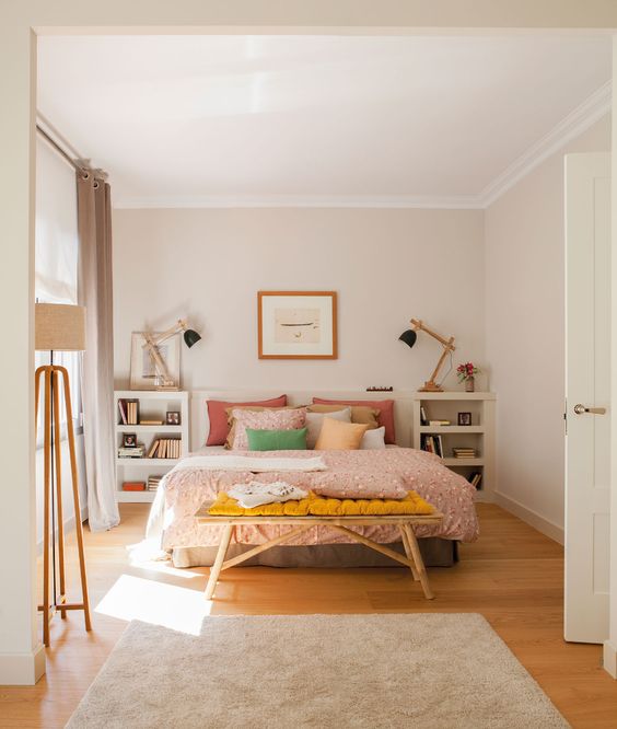 En nuestro listado de qué poner a los pies de la cama también hay un espacio para pequeñas estanterías. Que las grandes también se pueden integrar, pero nosotras nos decantamos por los muebles bajos para no separar visualmente el dormitorio.